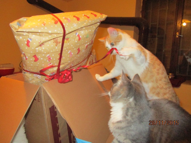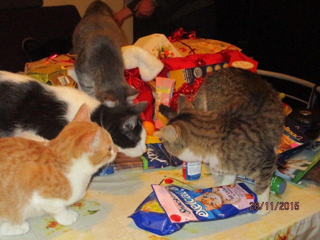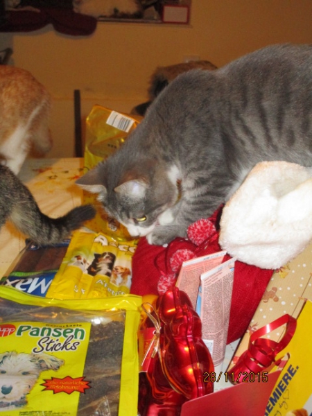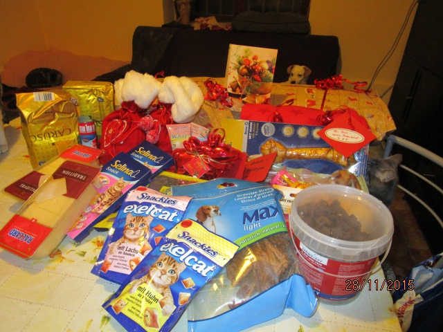 Ausser unserem Lieblingskaffee und Raclette-Käse gab es viele Leckerlis fuer Katzen und Hunde und extra Geschenke fuer Patenkind Roti, Lieblingskind Djina und fuer Dobrin der prächtige.