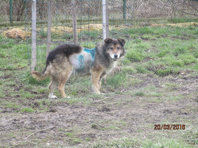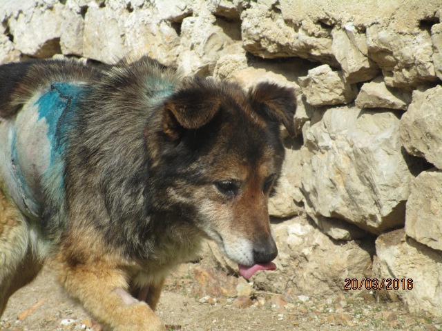 Fast zwei Monate hat es gedauert, bis Asja diesen alten Hund mit einer offenen Wunde am Hals endlich mit Futter gelockt, einfangen konnte. Beim Tierarzt wurde festgestellt, Alter Hund mit Tumor 29.2.2016 1dass es sich um einen Tumor handelt, der bereits aufgeplatzt ist. Leider hat er noch zwei weitere Tumore, die jedoch unter der Haut sind. Man kann nur hoffen, dass sie nicht in den Körper hinein gewachsen sind. Im Moment wird er mit Antibiotika behandelt wegen der offenen Wunde und für die OP vorbereitet. Drücken wir ihm ganz fest die Daumen, dass er es schafft!