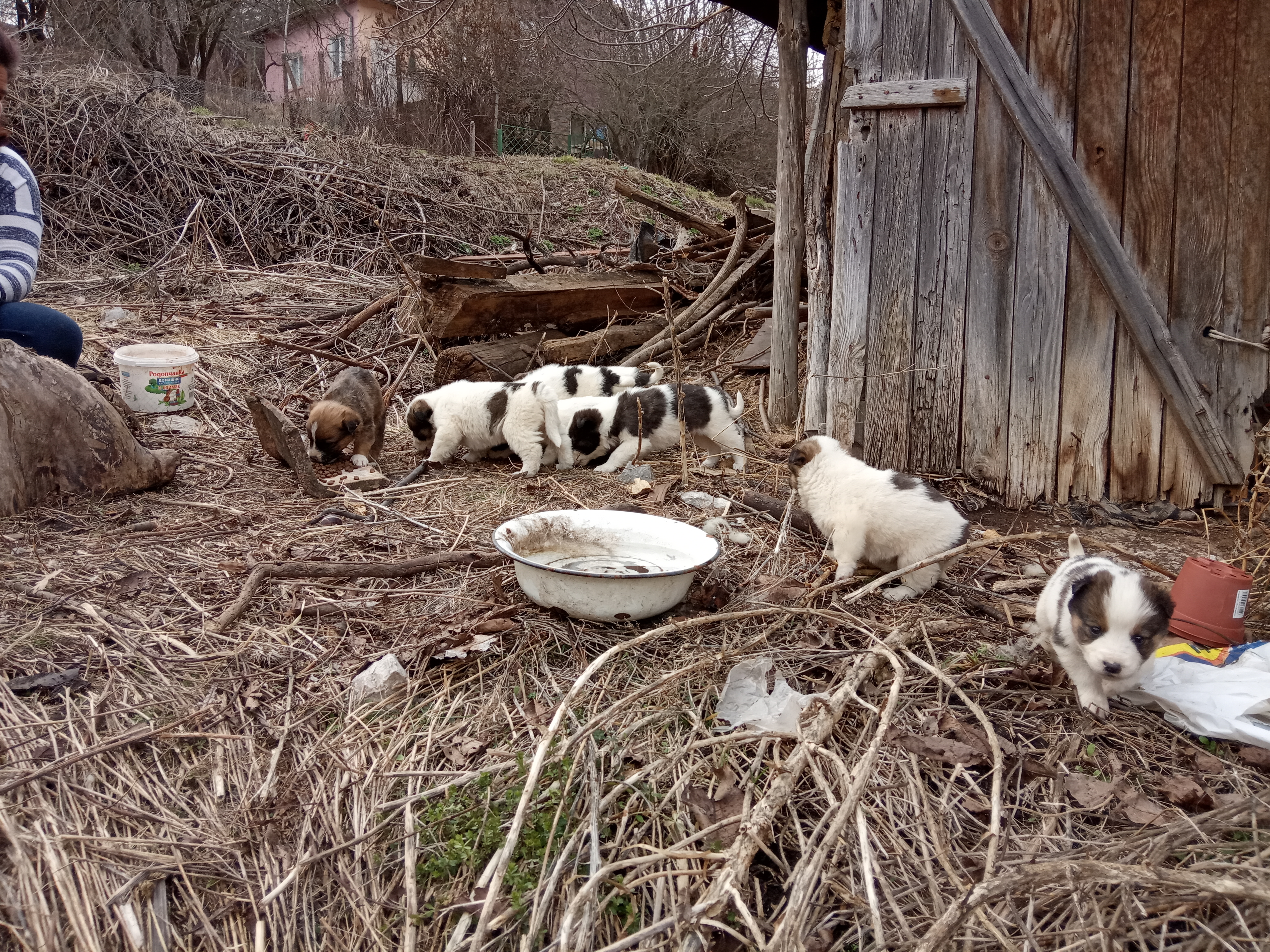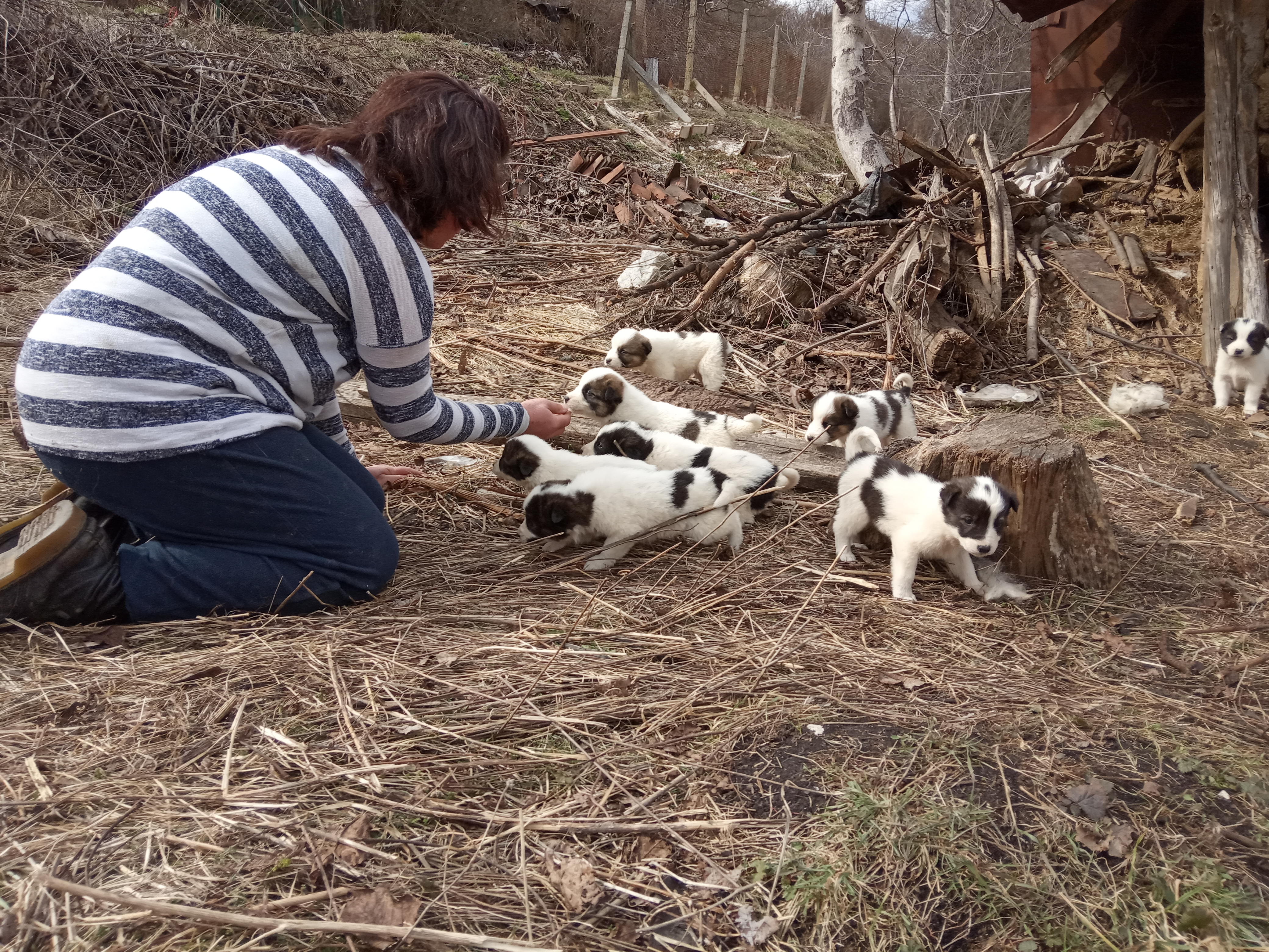 Letzte Woche rief die Gemeinde an mit der Bitte, einer alten Frau im Dorf Dragotinzi zu helfen. Es ist ein kleines Dorf, wie das unsere und dort streunen 2-3 Hunde. In einem verlassenen Haus hat eine Hündin 9 Junge geboren, sie ist sehr abgemagert und scheu. Die Frau hat sehr Mitleid mit der Hündin und hat Hilfe bei der Oekologin der Gemeinde Slivnitza gesucht.